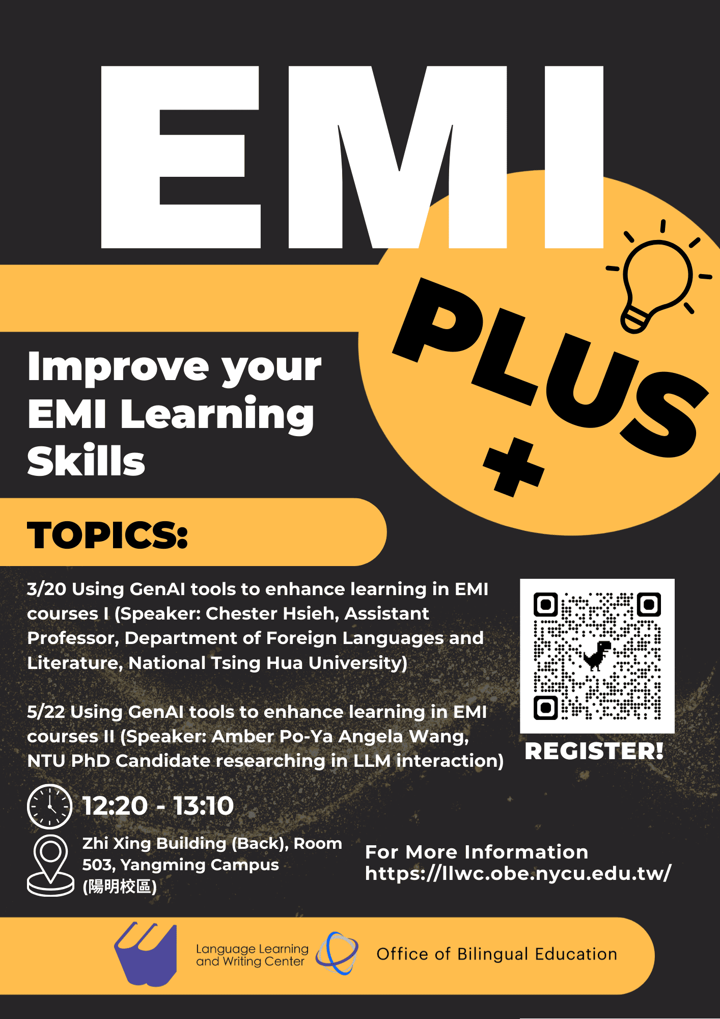 865 在114-2 EMI Plus+工作坊系列中提升您的EMI學習技巧! 3/20 使用 GenAI 工具提升 EMI 課程的學習效果 (一)(講師:Chester Hsieh, Assistant Professor, Department of Foreign Languages and Literature, National Tsing Hua University) 5/22 使用 GenAI 工具提升 EMI 課程的學習效果 (二)(講師:Amber Po-Ya Angela Wang, NTU PhD Candidate researching in LLM interaction) 時間:12:20-13:10地點:陽明校區知行樓後棟503室報名連結: https://forms.gle/qbJ5S7u4pVv3JV9b8 報名截止時間:2026年3月13日12:00 *教學教室位於 陽明校區 知行樓後棟503室 0 comment 0 FacebookTwitterPinterestEmail Language Learning and Writing Center previous post 114-2 英語桌遊時間 next post 114-2 英語工作坊系列 You may also like 114-2 英語工作坊系... 2026-02-04 114-2 英語桌遊時間 2026-02-04 114-2 跨文化交流時... 2026-02-04 114-2 英語咖啡聊天... 2026-02-04 114-1 跨文化英語工... 2025-08-20 114-1 AI智慧英語... 2025-08-20 114-1 英語工作坊系... 2025-08-20 114-1 英文電影時光 2025-08-20 114-1 英語咖啡聊天... 2025-08-20 113-2 英語工作坊系... 2025-01-20